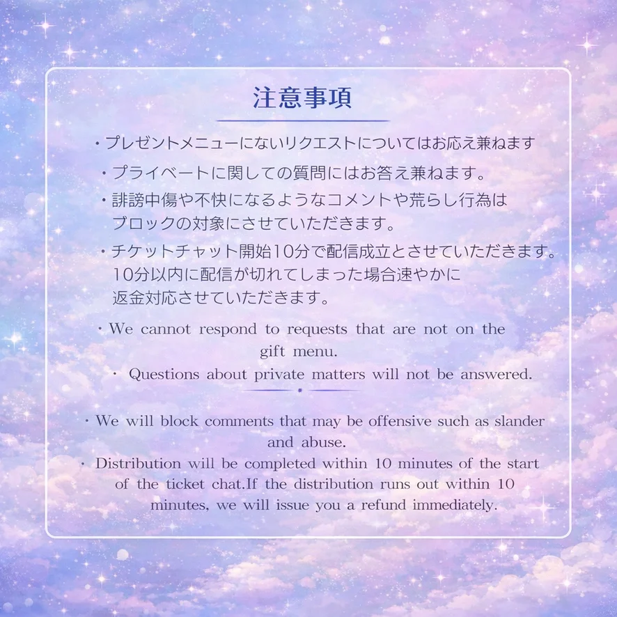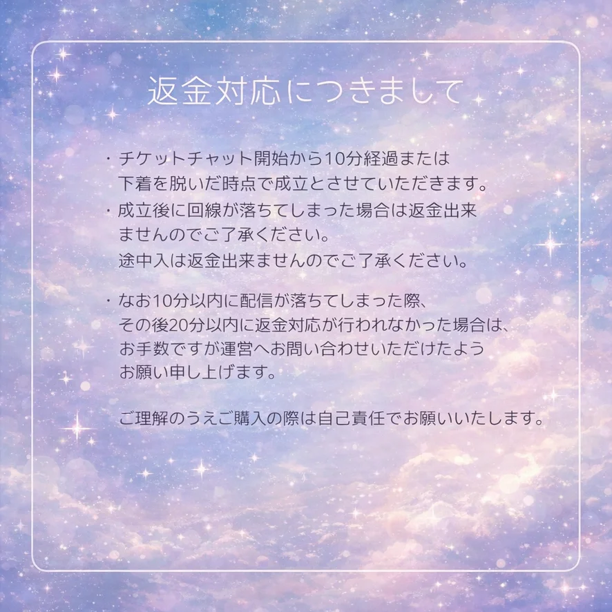 🐬チケチャ🐬 サムネなどがある為開始1分後からスタートします。 *開始5分経過後、服を脱いだ状態での返金はいたしません。 ・基本30分間になります。 * トラブル防止の為、チケチャ始まる前にはチケットを買わないでください *始まる前に買った分は返金出来ません。 * 基本的には90-200coinです。 ●グルチャ ・サムネなどがある為開始1分後からスタートします。 * 基本12coinです。 * 基本、20分~30分あたりで配してます。 !お願い事! *無理な要求をしてこないでください *性器露出はできません 有料中冗談でも、法律違反な事を言ってきた場合、即ブロックします。
